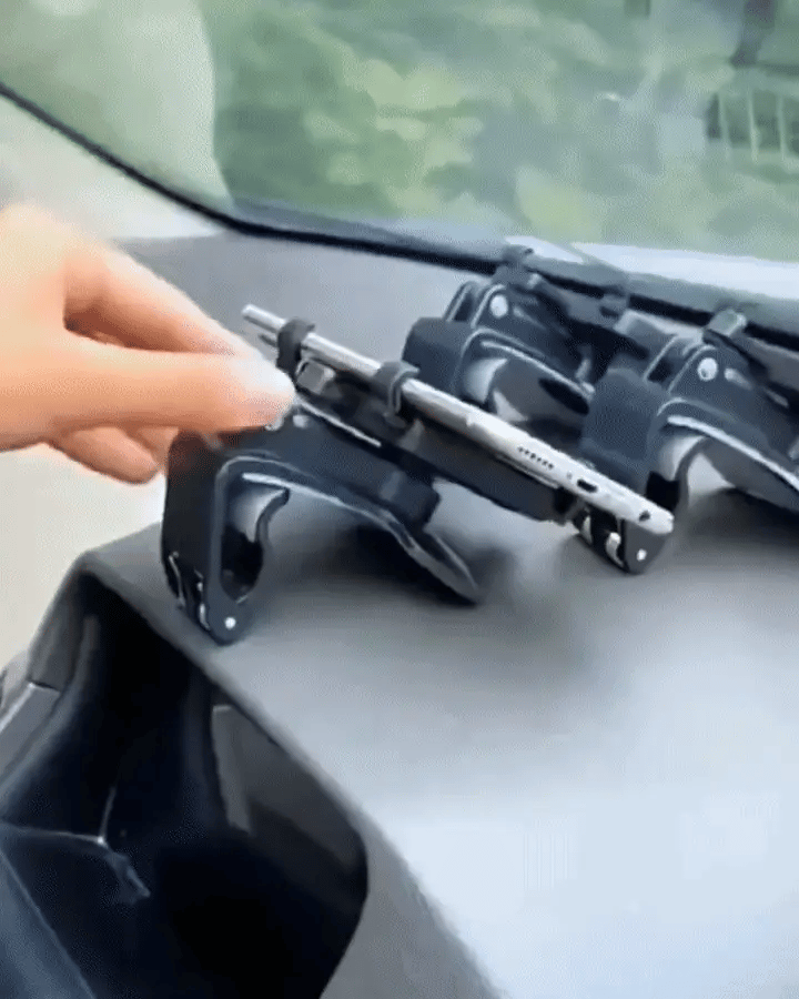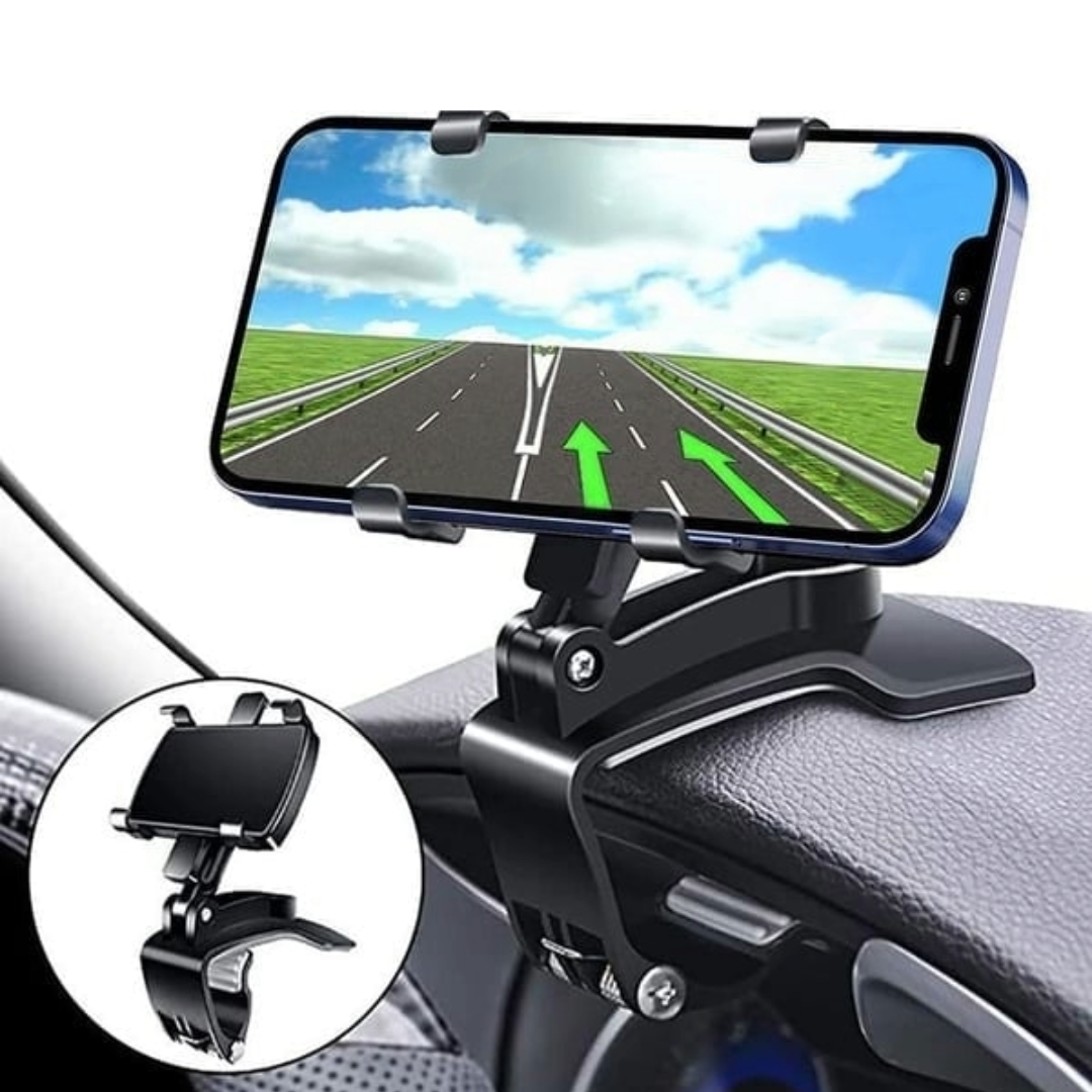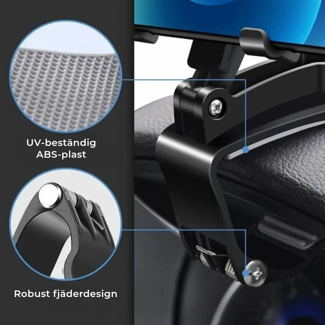 Förhindra farliga situationer på vägen! Tack vare den ergonomiska designen placerar du din telefon säkert i ögonhöjd, så att du kan se din GPS eller samtal utan att förlora sikten på vägen. Inget snurrande, ingen distraktion – bara säker körkomfort.