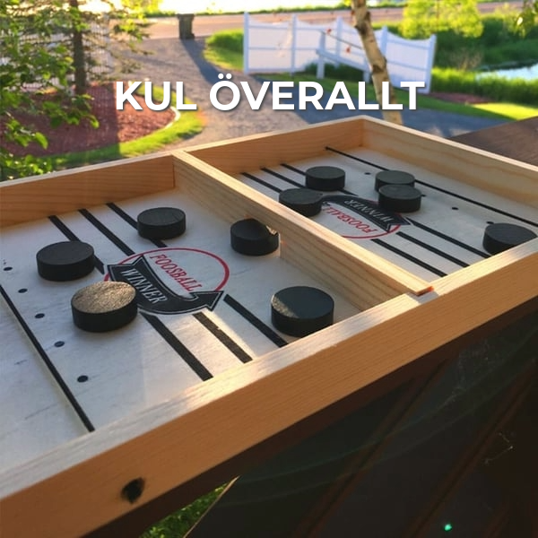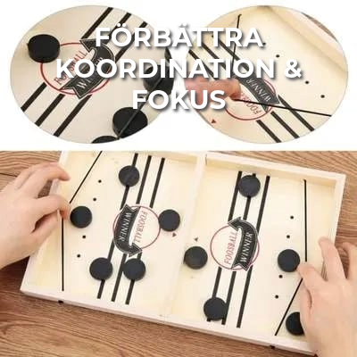 Upplev spännande matcher där spelarna skjuter puckarna till andra sidan med bara en hand och ett gummiband!