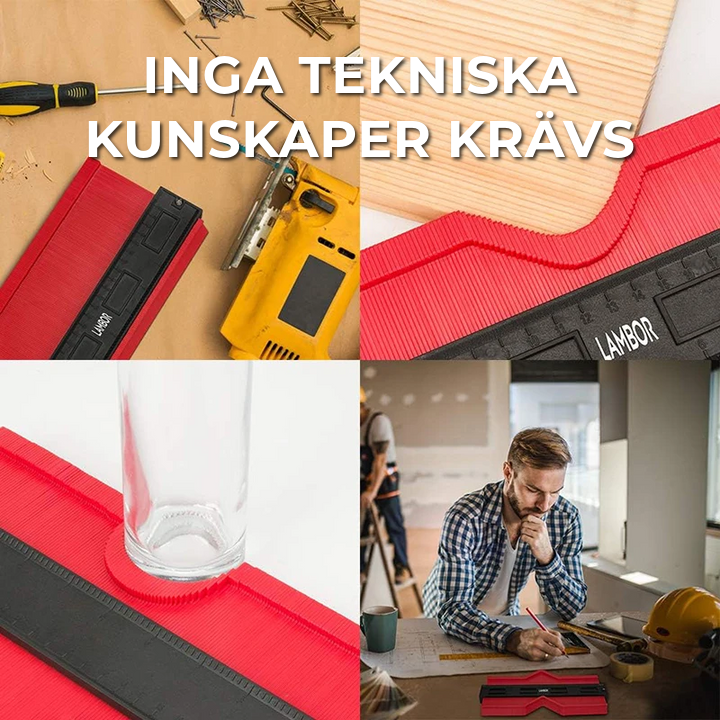 Med denna linjal kan du enkelt mäta och kopiera komplexa former. Detta praktiska verktyg hjälper dig att skapa precisa mönster av kurvor och vinklar, så att du kan såga golvdelar med millimeterprecision.
