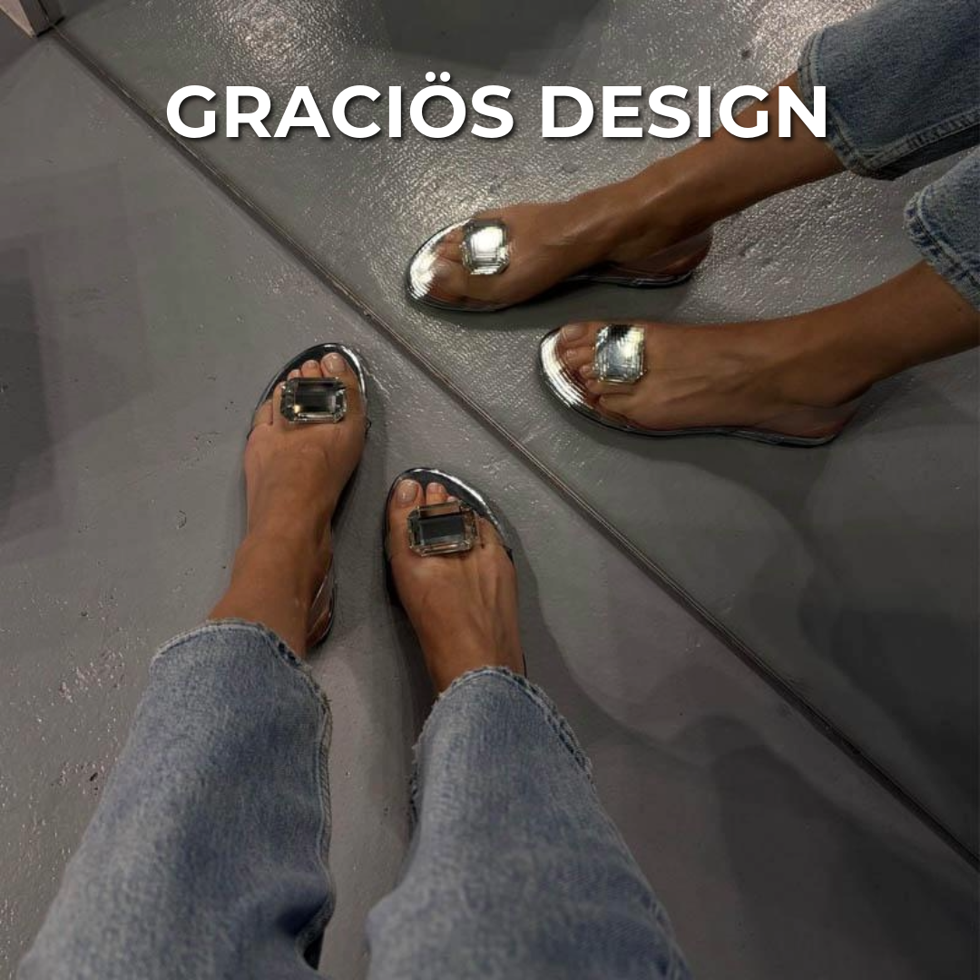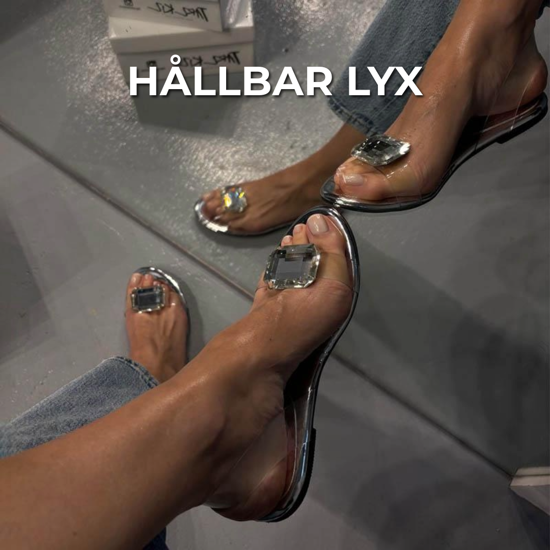 Den bekväma slip-on modellen med justerbar hälrem gör att sandalerna sitter stabilt och bekvämt utan att kompromissa med stilen. Den genomskinliga designen med den gnistrande stenen gör dem tidlösa och sofistikerade.