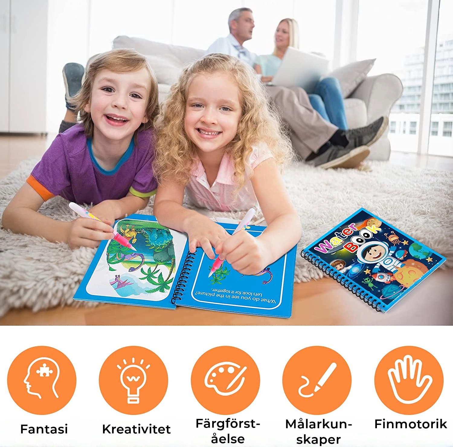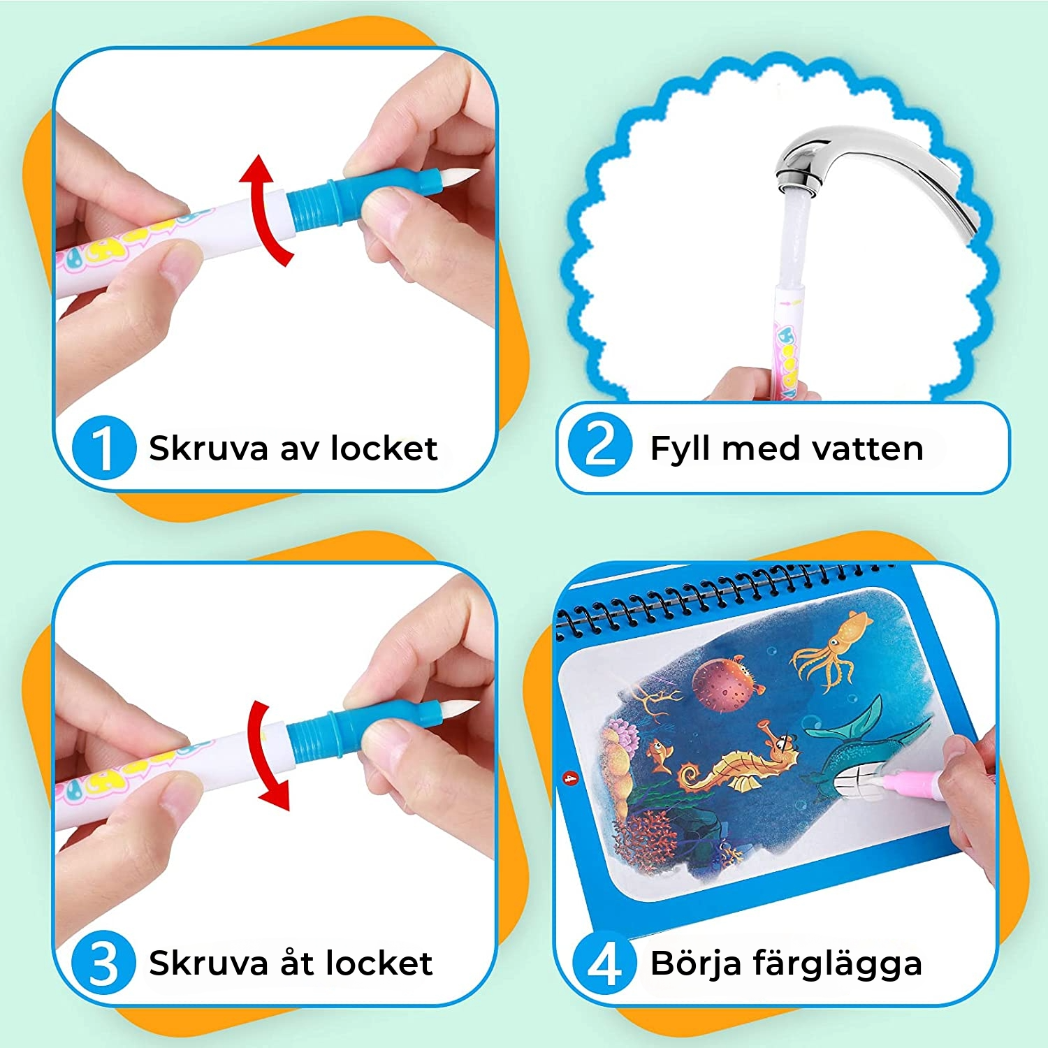Se hur teckningarna blir levande! Med bara lite vatten förvandlas teckningarna till livfulla, färgglada scener som inspirerar till oändlig kreativitet och fantasi.