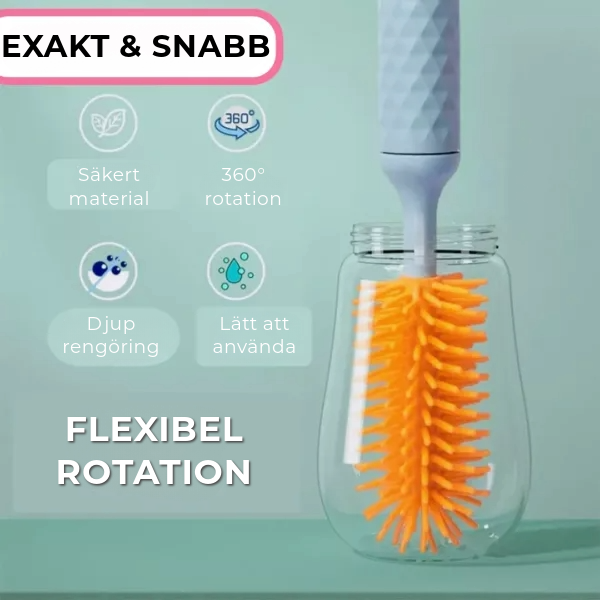 Den kraftfulla 360-graders rengöringsborsten tar bort alla typer av rester och bakterier samt envisa fläckar från varje hörn, så att flaskor och drickflaskor förblir skinande rena och hygieniska.
