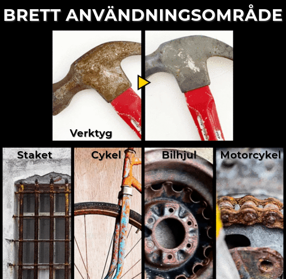 Oavsett om det är metall, krom eller målade ytor, fungerar vår Rostborttagningsspray på alla typer av material. Perfekt för bilar, verktyg, köksapparater, trädgårdsmöbler och mer.