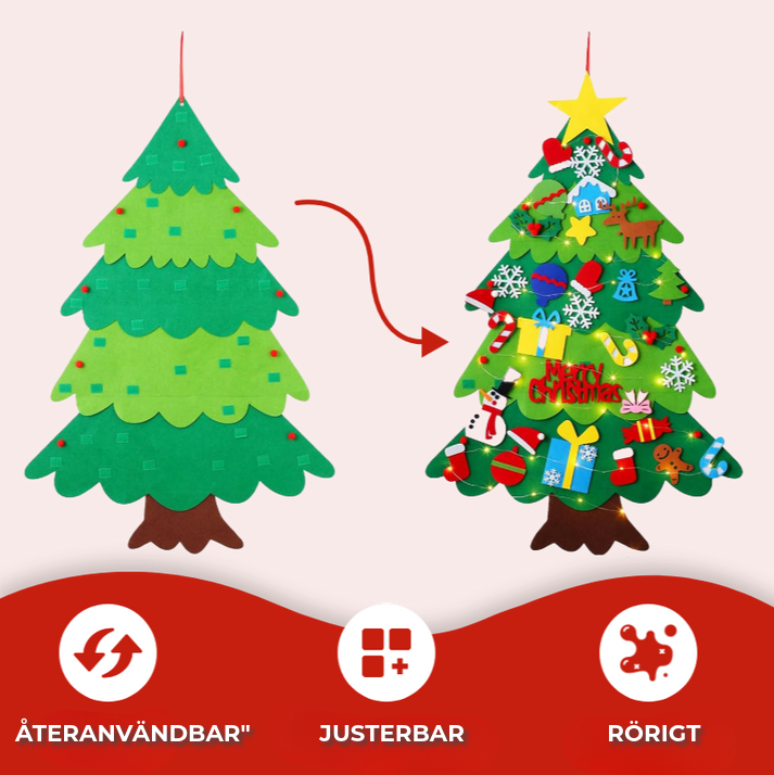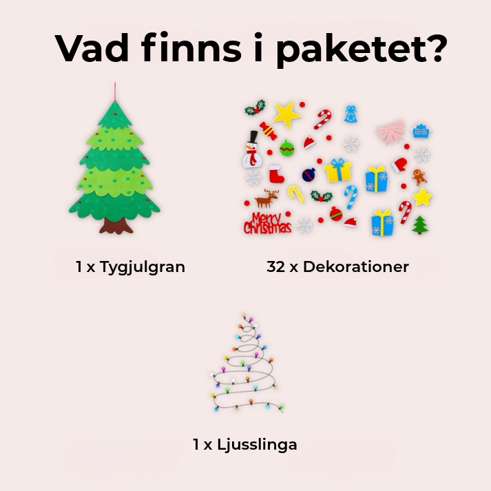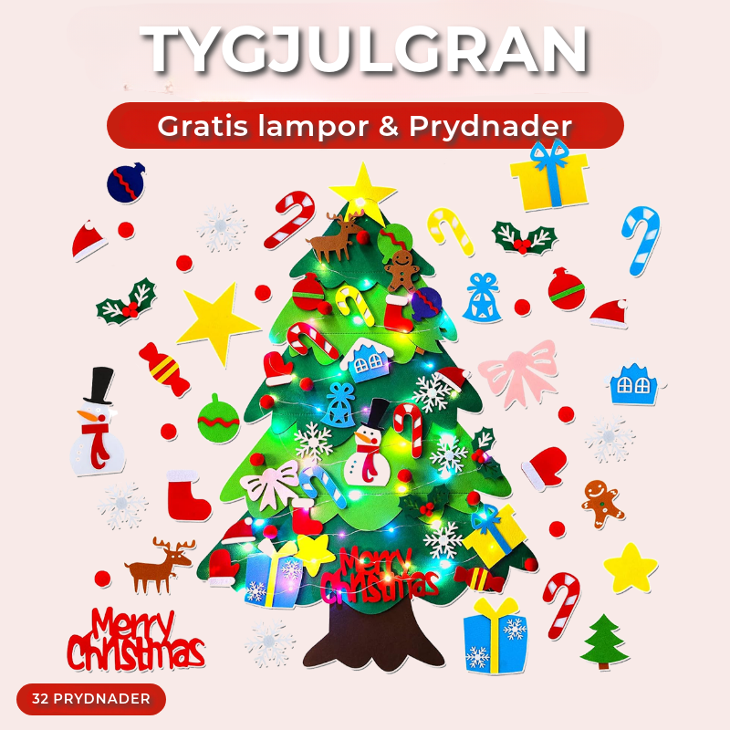 Din tygjulgran levereras med 32 roliga dekorationer, så att du kan börja dekorera direkt. Dessutom får du festliga ljus för att ge din juldekoration en magisk känsla. Detta kompletta paket innehåller allt du behöver för en förtrollande och vacker upplevelse för dina små!